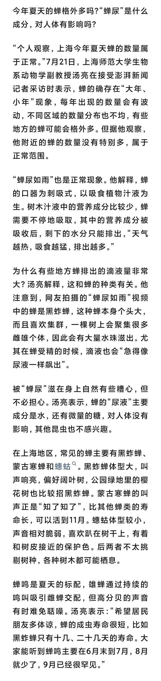 盛夏,知了叫个不停。有网友发帖称,上海的蝉多到“蝉灾的程度”,叫得让人耳膜痛,走在树下冷不丁被“蝉尿”飙了一头。澎湃新闻记者检索发现,“蝉尿如雨”的情况在全国多地都有出现。
