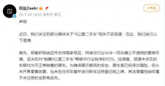 极氪汽车关于“0公里二手车”的官方声明