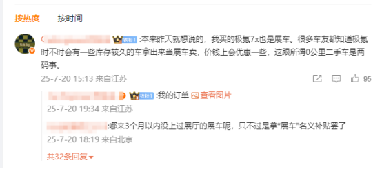 记者注意到,网友“Car*何先生”在这份声明下方留言称,自己购买的极氪7x也是展车,很多车友都知道极氪时不时会有一些库存较久的车拿出来当展车卖,价钱上会优惠一些,这跟所谓“0公里二手车”是两码事。