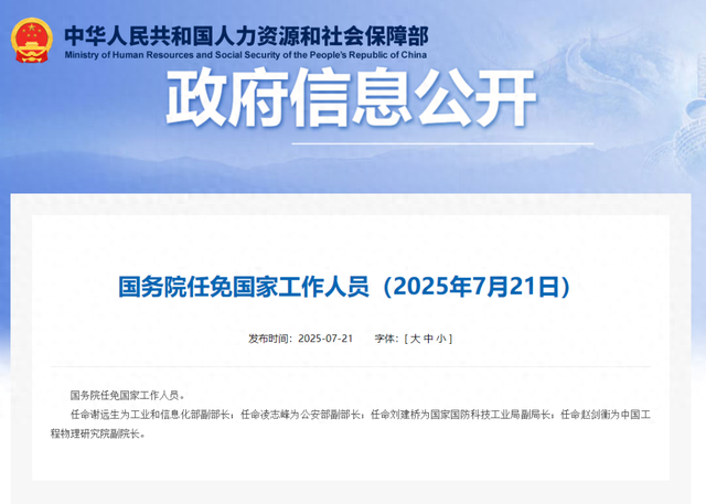 国务院:任命谢远生为工信部副部长,凌志峰为公安部副部长 访客 2025-07-21 18:56:27 73284 抢沙发 默认 7月21日,据人社部网站消息,国务院任免国家工作人员。任命谢远生为工业和信息化部副部长;任命凌志峰为公安部副部长;任命刘建桥为国家国防科技工业局副局长;任命赵剑衡为中国工程物理研究院副院长。来源:人社部网站 标签: 副部长 工业局 海报 阅读 QQ 分享 微博分享 微信分享 分享 上一篇“85后”邵钶茸、丁仁慎,同日官宣落马 下一篇尹锡悦妻子金建希的博士学位,被撤销 “85后”邵钶茸、丁仁慎,同日官宣落马上一篇 尹锡悦妻子金建希的博士学位,被撤销下一篇 相关推荐 副部长工业局 贵州仁怀通报,男子茅台镇建厂投资8亿遭强行接管事件 2025-09-24 三名中央委员,职务有变动 2025-08-27 国务院任命凌志峰为公安部副部长 2025-07-21 吴浩首次以中组部副部长的身份亮相 新职务正式公布 2024-12-31 发表评论取消回复 快捷回复: 评论列表 (暂无评论,73284人围观)参与讨论 还没有评论,来说两句吧...