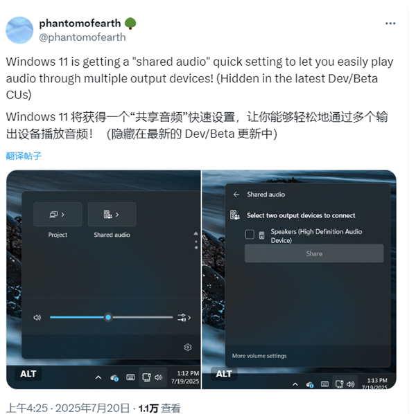 @phantomofearth率先发现了这一功能,并分享了相关截图,展示了在Windows 11设置面板中新增的"共享音频"按钮。