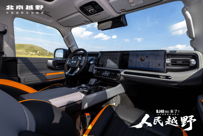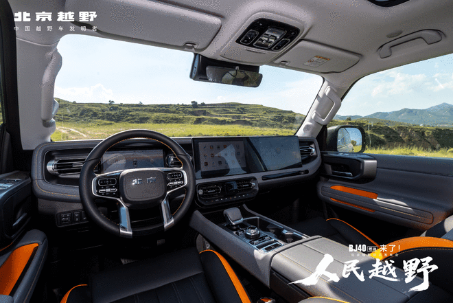在内饰方面,你很难想象一台主打越野的产品,如今车内也用上了大面积的软包材料,同时也放上了两块“大彩电”,包括12.8英寸中控屏和12.8英寸的副驾屏。大尺寸中控屏也算是当下各大车企的基操了,短暂的体验没有发现大屏有什么问题,流畅度和清晰度都能令人满意,功能上还支持Carplay手机互联和双模高德导航等。还有就是位于中间两个空调出风口之间的小屏幕,也和BJ60一样可以自由切换成自己想要的功能。