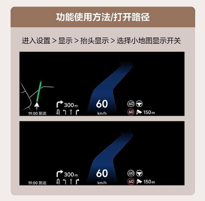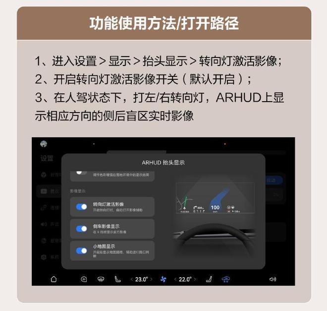 问界M9系列与M8的AR-HUD新增两项实用功能。其一,转向灯激活盲区影像功能,在人驾状态下,打左/右转向灯时,AR-HUD会显示相应方向的侧后盲区实时影像,提升变道安全性。同时新增AR-HUD小地图开关功能。