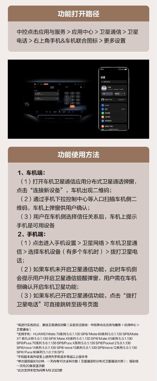 具体来看,此次OTA后,2025款问界M9新增分布式车载卫星通信功能,通过分布式通信技术,可将车机的卫星通信能力共享给手机,让用户在离车30米范围内,可用手机拨打或接听卫星电话。值得一提的是,该功能需进行实名验证以激活卫星通信功能,单次通话最长5分钟,一天内卫星通话和分布式卫星通话共用10次主叫次数,短/彩信一天内可发送20条。