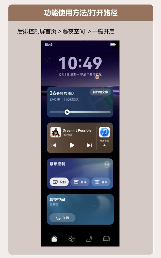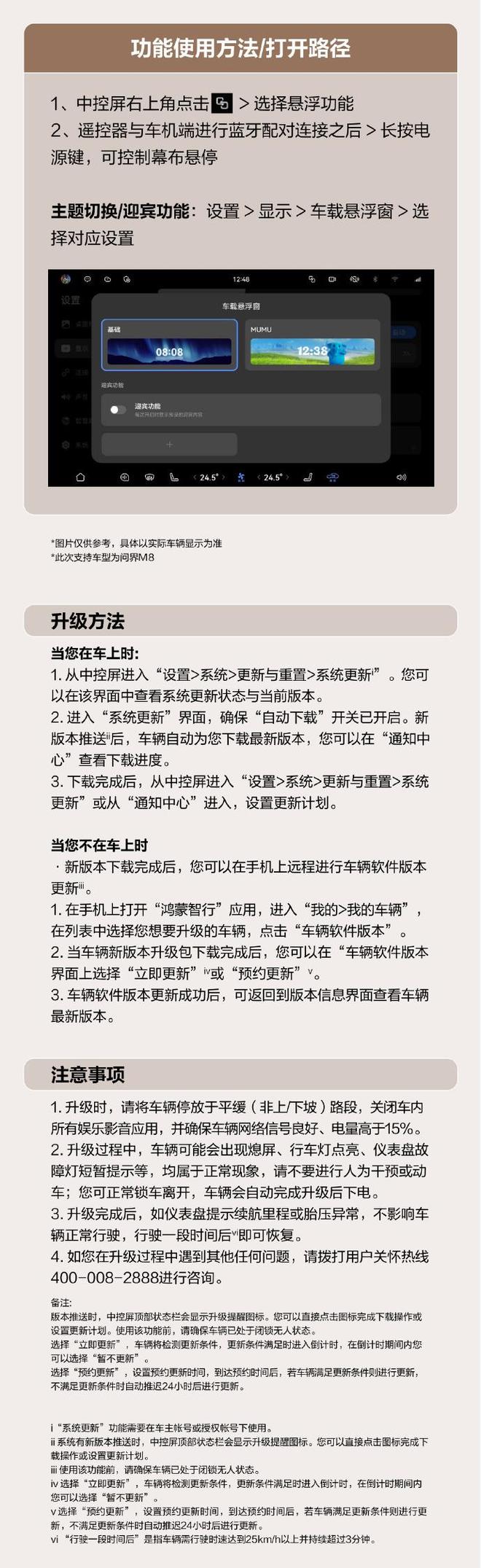 问界M8新增车载悬浮窗功能,开启后,后排投影幕布将悬停至1/4位置,可实时显示导航、音乐、时间、天气等信息,支持基础主题和MUMU主题,还可个性化设定迎宾功能的背景、问候语和字体。