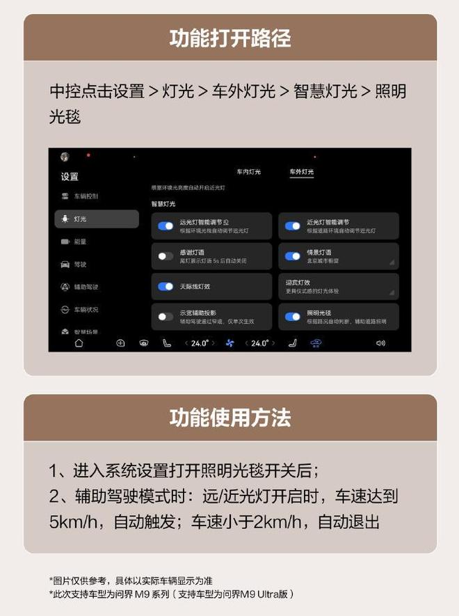 问界M9系列新增智能动态光毯(照明光毯)功能,该功能可自主开启,指引行车轨迹,光毯会随光线、车速、转向、路况进行动态调节,无论人驾还是辅助驾驶状态均可支持。
