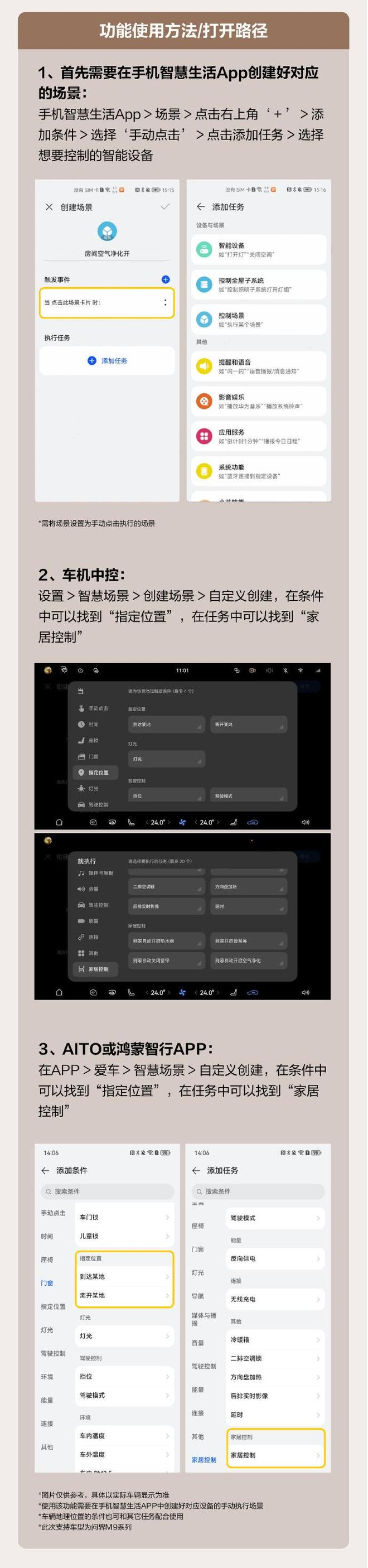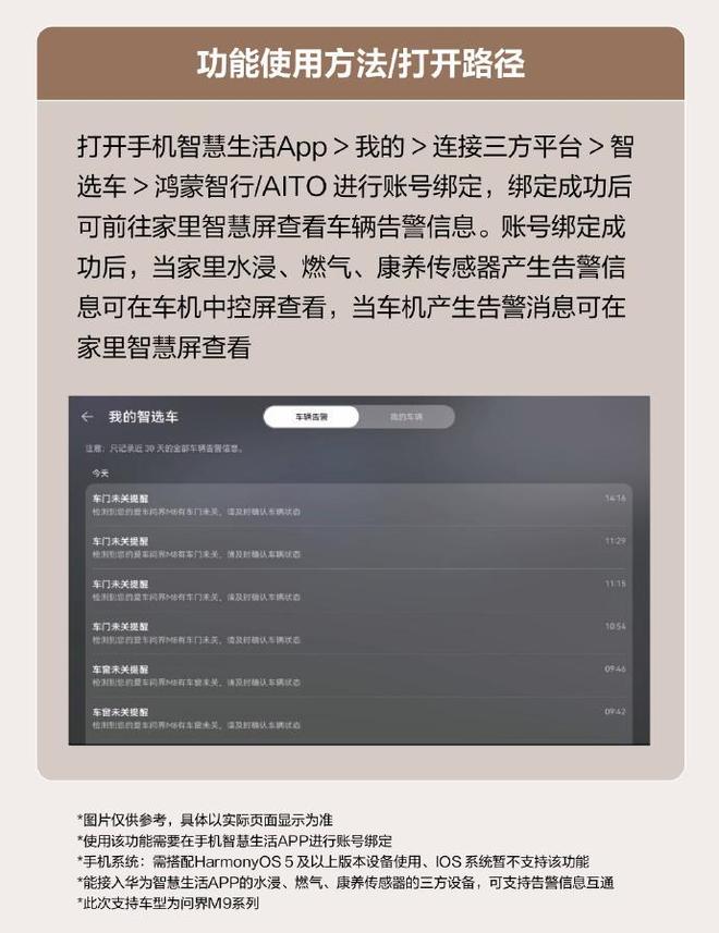 智慧场景新增地理位置触发功能。问界M9系列可根据车辆地理位置触发控制智能家居设备,例如到家时自动打开空调、净化器,离家时自动关闭。车家告警消息互通,华为智能家居与车机互联后,车机告警消息可在家庭智慧屏查看,家中告警消息(如水浸、燃气、康养传感器告警)可在车机中控屏查看。