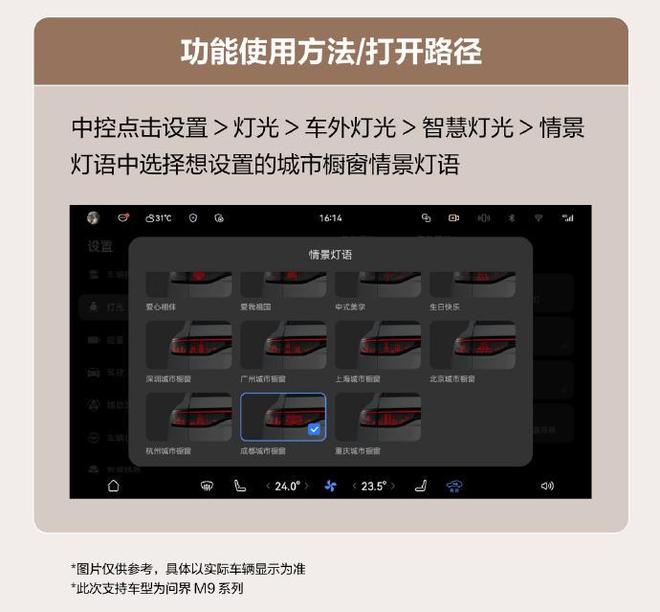 问界M9系列新增情景灯语城市橱窗选项,为用户提供更丰富的场景选择,用户可选择自己所在城市为其应援,也能挑选喜欢的城市。此外,后排控制屏新增暮夜空间功能,用户通过控制屏首页一键开启后排全黑模式,系统会自动关闭天窗遮阳帘、阅读灯、氛围灯、车窗,将隐私玻璃调至最暗并展开幕布。