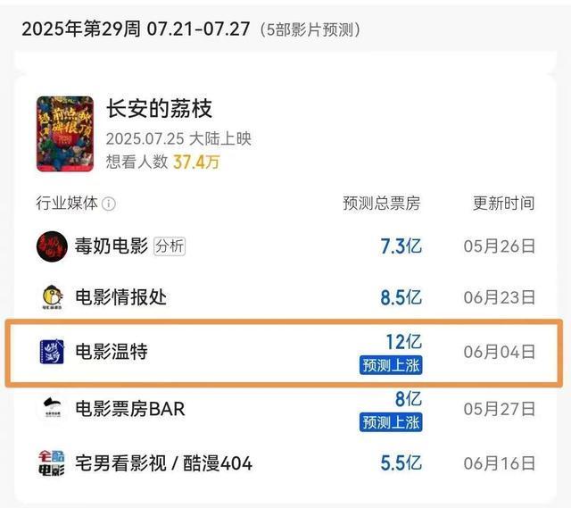 《长安的荔枝》改编自马伯庸的同名小说,由大鹏执导并担任主演,内容围绕九品小官李善德如何“将鲜荔枝从岭南送到长安”的故事展开。前期点映口碑不俗,在多家专业平台预测中被看好,是最有希望拿下今年暑期档第一个10亿元票房的影片,有专业平台最高给出了12亿元的票房预测。