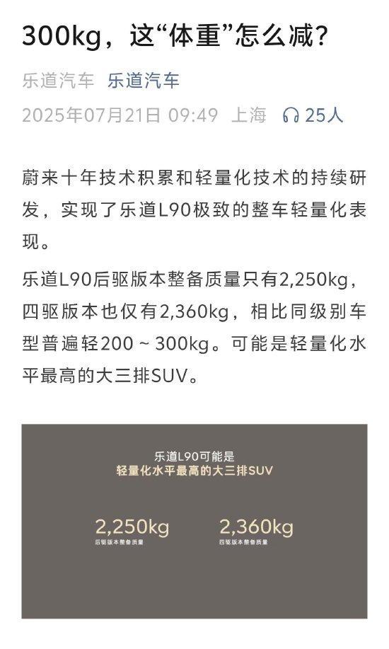 有意思的是,在他发布微博之后,乐道汽车随后在官方公众号发文,详细解释了乐道L90是怎么减重300KG的,双方有些隔空喊话的味道。