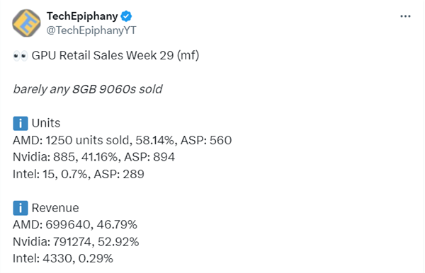 不过报告中最令人意外的细节,是AMD Radeon RX 9060 XT的8GB版本的销量惨淡。
