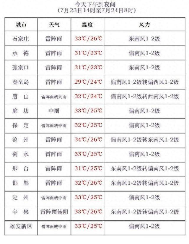 今天下午到夜间,全省阴,大部分地区有雷阵雨或阵雨,其中唐山、秦皇岛、保定、廊坊、雄安新区、石家庄北部、沧州北部的部分地区有中到大雨,局地有暴雨,雷雨时局地伴有短时强降水、短时大风等强对流天气。最高气温,张家口北部、承德北部、保定西北部23~29℃,其他地区30~34℃。最低气温,张家口、承德、秦皇岛北部、保定西北部12~21℃,其他地区22~26℃。