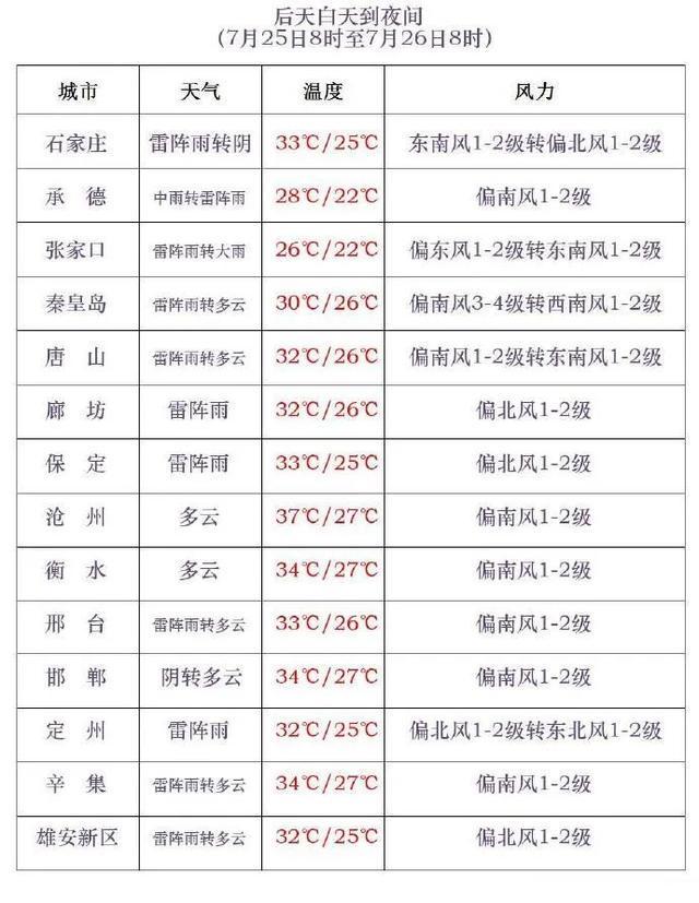 25日夜间到26日,张家口、承德、唐山、秦皇岛、廊坊北部、保定、雄安新区、石家庄多云间阴有雷阵雨或阵雨,部分地区有中到大雨,局地有暴雨,其他地区晴间多云。