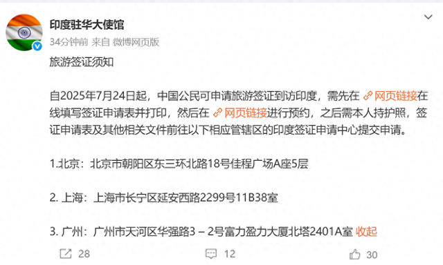 据印度驻华大使馆官方微博发布,自2025年7月24日起,中国公民可申请旅游签证到访印度。这是自2020年暂停后,印度时隔5年首次恢复向中国公民签发旅游签证。此前印度对中国公民赴印商务签证也有所限制,近期也得到了一定程度的放松。