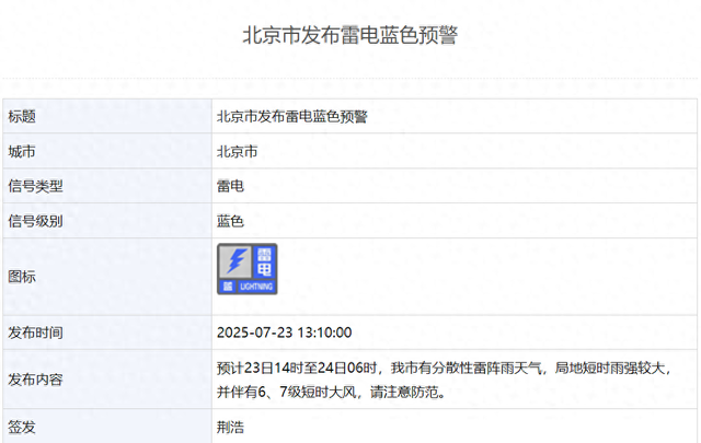 7月23日13时10分,北京市发布雷电蓝色预警。预计23日14时至24日06时,我市有分散性雷阵雨天气,局地短时雨强较大,并伴有6、7级短时大风,请注意防范。