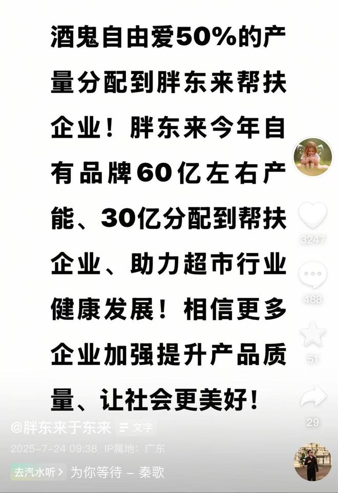 于东来:胖东来今年自有品牌60亿左右产能、30亿分配到帮扶企业 访客 2025-07-24 15:29:20 46139 抢沙发 默认 今日,胖东来创始人于东来透露酒鬼自由爱50%的产量分配到胖东来帮扶企业。此外,胖东来今年自有品牌60亿左右产能、30亿分配到帮扶企业。 标签: 东来 分配 海报 阅读 QQ 分享 微博分享 微信分享 分享 上一篇自有品牌棉密码卫生巾含致癌物?辛选回应:产品不存在致癌问题 下一篇格力电器:从未委托或授权任何第三方机构受理消费者的售后服务 自有品牌棉密码卫生巾含致癌物?辛选回应:产品不存在致癌问题上一篇 格力电器:从未委托或授权任何第三方机构受理消费者的售后服务下一篇 相关推荐 东来分配 胖东来郑重声明,从未通过直播进行售卖 2025-12-08 胖东来开放日参访无收获可退费政策实施,企业十年承诺与反思 2025-11-20 柴怼怼与胖东来于东来纠纷判决赔款260万 2025-11-11 网红柴怼怼恶意营销碰瓷胖东来遭批捕,央视曝光案件内幕 2025-11-05 许昌警方通报,胖东来生活广场发生伤人案件,嫌疑人冯某某落网 2025-11-03 于东来批评某企业,缺乏感恩之心,恶意竞争行为揭示人性之恶 2025-10-22 于东来严厉批评某企业,缺乏感恩之心,跨区域恶意竞争暴露人性之恶 2025-10-22 永辉胖改门店点亮郑州,城市幸福指数持续上升,从1到7的蜕变之路 2025-10-01 发表评论取消回复 快捷回复: 评论列表 (暂无评论,46139人围观)参与讨论 还没有评论,来说两句吧...