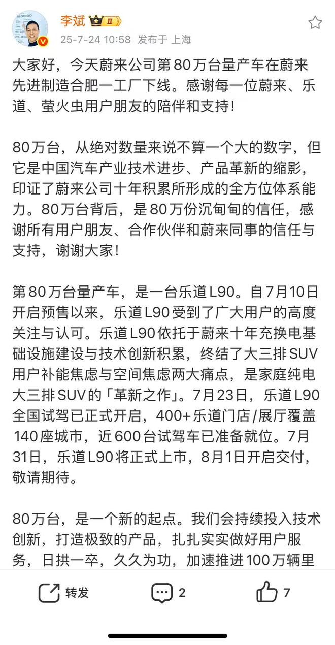 李斌提到第80万台量产车,是一台乐道L90。7月31日,乐道L90将正式上市,8月1日开启交付。