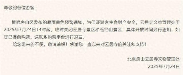 根据房山区发布的暴雨黄色预警通知,为保证游客生命财产安全,云居寺文物管理处于2025年7月24日14时起,临时关闭云居寺景区和石经山景区,具体开放时间另行通知,如您已提前购票,请联系购票平台进行退票。