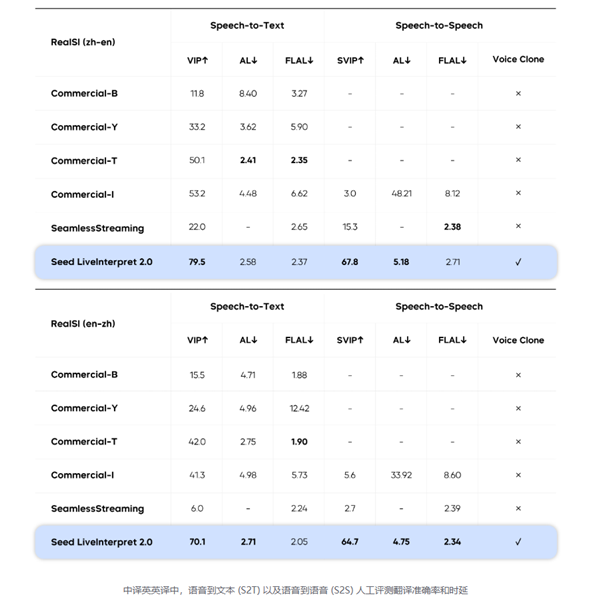 在延迟表现上,Seed LiveInterpret 2.0在语音到文本场景中,输出首字平均延迟仅2.21秒,在语音到语音场景中,输出延时仅2.53秒,做到了对翻译质量以及时延的均衡。