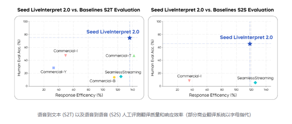 模型测评结果显示,在语音到文本同传任务中,Seed LiveInterpret 2.0中英互译平均翻译质量的人类评分达到74.8(评估译文准确率,满分100),较排名第二的基准系统(47.3分)超出58%。