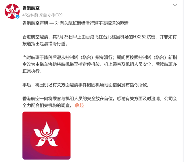 刚刚,香港航空官方微博就此事发布声明——对有关航班滑错滑行道不实报道的澄清: