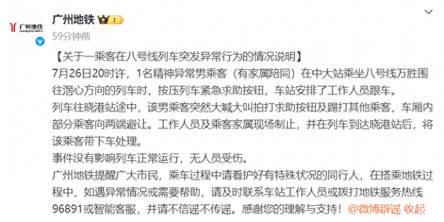 7月27日,@广州地铁 发布《关于一乘客在八号线列车突发异常行为的情况说明》。