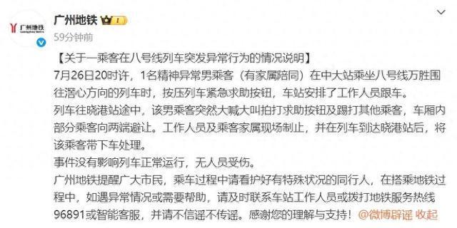 广州地铁通报乘客突发异常行为:有家属陪同,无人员受伤