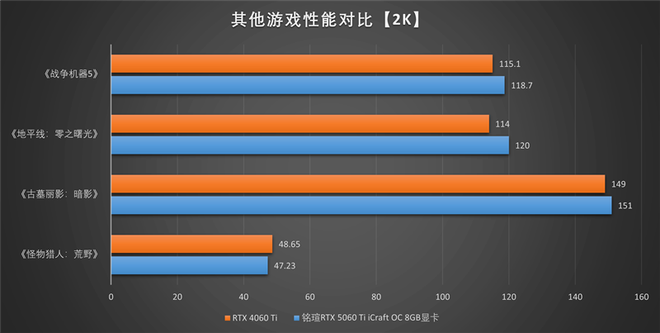 铭瑄GeForce RTX 5060 TiiCraft OC 8GB显卡在一些老3A游戏中,2K分辨率轻松帧率上百,只有最新的《怪物猎人:荒野》表现不够稳定,游戏设置页面就有提示显存不足。2K分辨率下整体表现比上代的RTX 4060 Ti略有提升,在性能要求不太高的游戏中,4K分辨率也有一战之力。