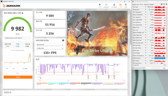 在3DMark的Fire Strike Ultra(DX11+4K渲染分辨率)测试中,总成绩为9982,其中显卡分数为9584。