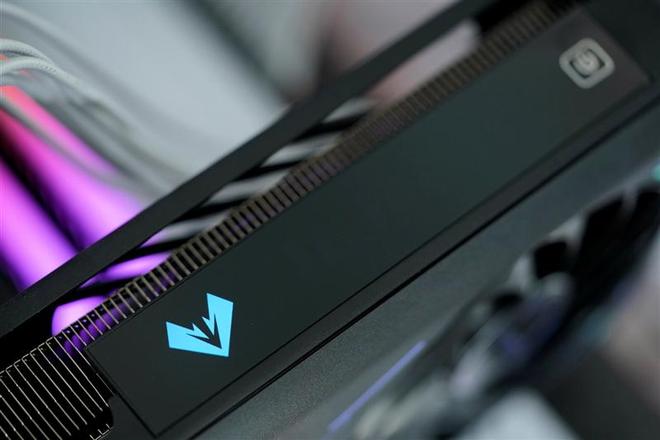 铭瑄GeForce RTX 5060 TiiCraft OC 8GB显卡顶部的Logo灯特写,同样沿用电竞之心的控制按钮,轻按可以在多种灯效间切换。