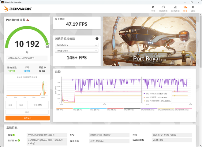 在3Dmark中测试实时光追性能的Prot Royal测试中,总成绩为10195,其中显卡测试成绩为47.19FPS。