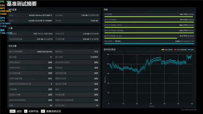 在《战争机器5》中,使用超高画质进行测试,2K分辨率下平均帧率为118.7。
