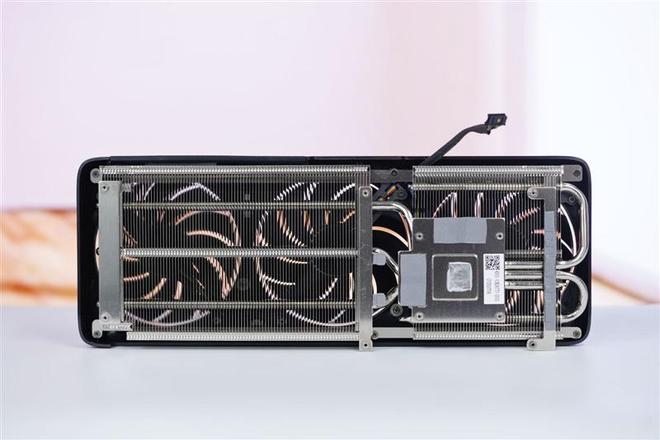 铭瑄GeForce RTX 5060 TiiCraft OC 8GB显卡的寒翼冰脉散热矩阵散热器的全貌,GPU和显存芯片位置都有导热硅脂和导热胶条,可以快速把芯片热量通过镀镍铜底传递给三根复合热管,最后在高密度散热鳍片上高效散热。