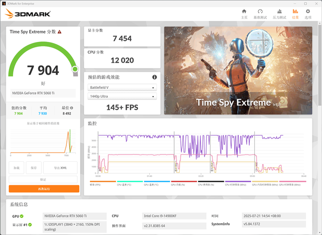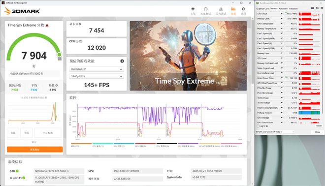 在3DMark的Time Spy Extreme(DX12+4K渲染分辨率)测试中,总成绩为7904,其中显卡分数为7454。