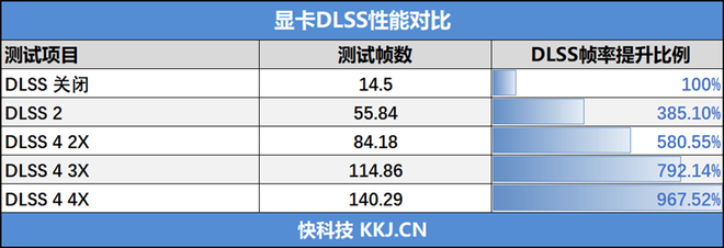 在3Dmark NVIDIA DLSS功能测试中,关闭DLSS 4时帧数为14.5FPS左右,开启DLSS 4 2x之后帧数上升为84.18FPS,开启DLSS 4 3x之后帧数上升为114.86FPS,开启DLSS 4 4x之后帧数上升为140.29FPS。