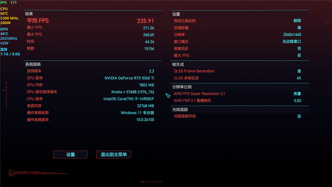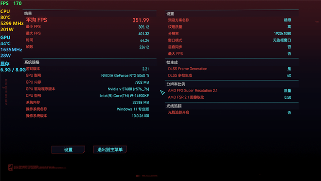 《赛博朋克:2077》在开启DLSS 4最高的4X级别多帧生成时,2K分辨率下平均帧率为235.91,1080P分辨率下测试帧率为351.99。