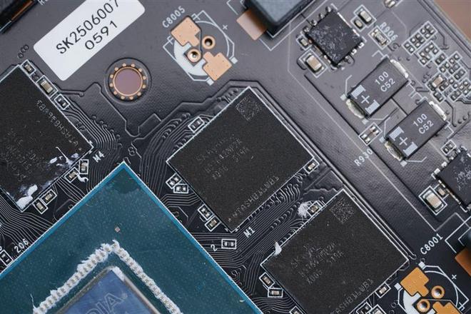 来自三星的GDDR7显存颗粒,一共4枚共同构成8GB容量,环绕GPU芯片布置。