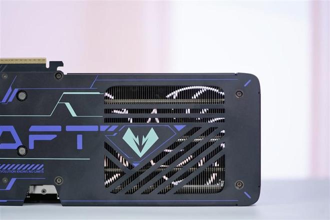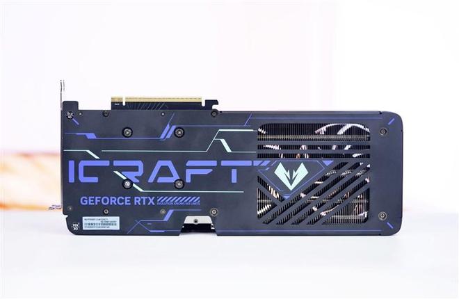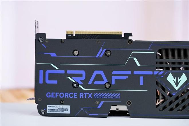 铭瑄GeForce RTX 5060 TiiCraft OC 8GB显卡的金属背板表面使用了醒目的多色丝印工艺,极具特色的荧光青蓝线条组成铭瑄“iCraft”字样和钻石型的Logo。尾部有大量几何形镂空,方便风扇直接吹透散热器,强化散热效果。