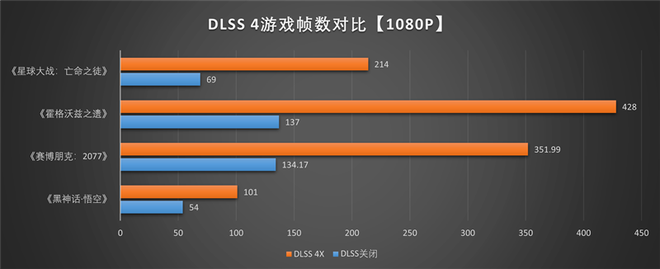 《霍格沃兹之遗》在开启DLSS 4最高的4X级别多帧生成时,2K分辨率下测试帧率为296,1080P分辨率下测试帧率为428。