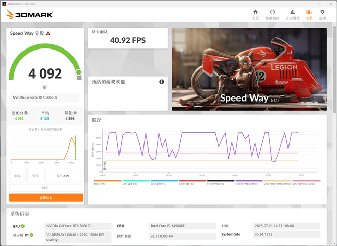 在3DMark测试综合性能的Speed Way测试中,总成绩为4092,其中显卡测试成绩为40.92FPS。
