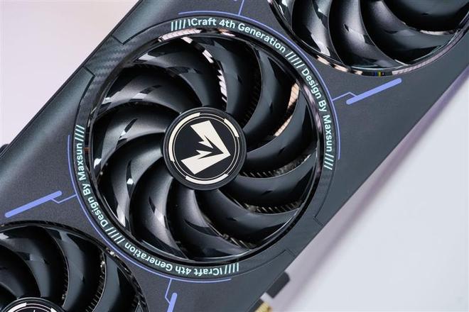 11叶聚风环形风扇特写,经过精心设计的扇叶减少了湍流损耗,风量风压综合性能提升20%,内部使用高端进口滚珠轴承,噪音控制更加优秀。三枚风扇采用正逆转设计,中间的风扇的碳纤维装饰圈也同样有配备。