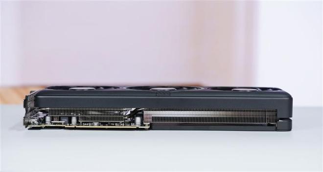 从侧面可以看到铭瑄GeForce RTX 5060 TiiCraft OC 8GB显卡后半部超过一半的长度都是纯散热片。