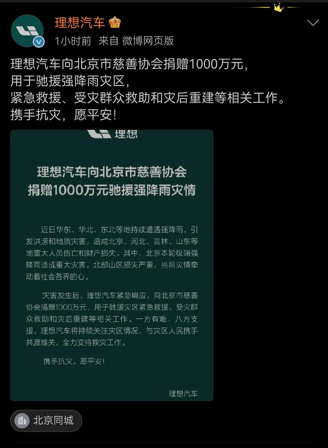 7月29日,理想汽车宣布向北京市慈善协会捐赠1000万元,用于支援北京及其周边地区因极端强降雨引发的洪涝和地质灾害的紧急救援、受灾群众救助和灾后重建工作。