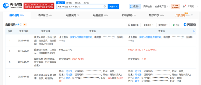 天眼查App显示,近日,淘宝(中国)软件有限公司、浙江天猫技术有限公司发生工商变更,蒋芳在上述两公司由执行董事兼总经理变更为经理、董事,同时,两家公司注册资本均有小幅增加。