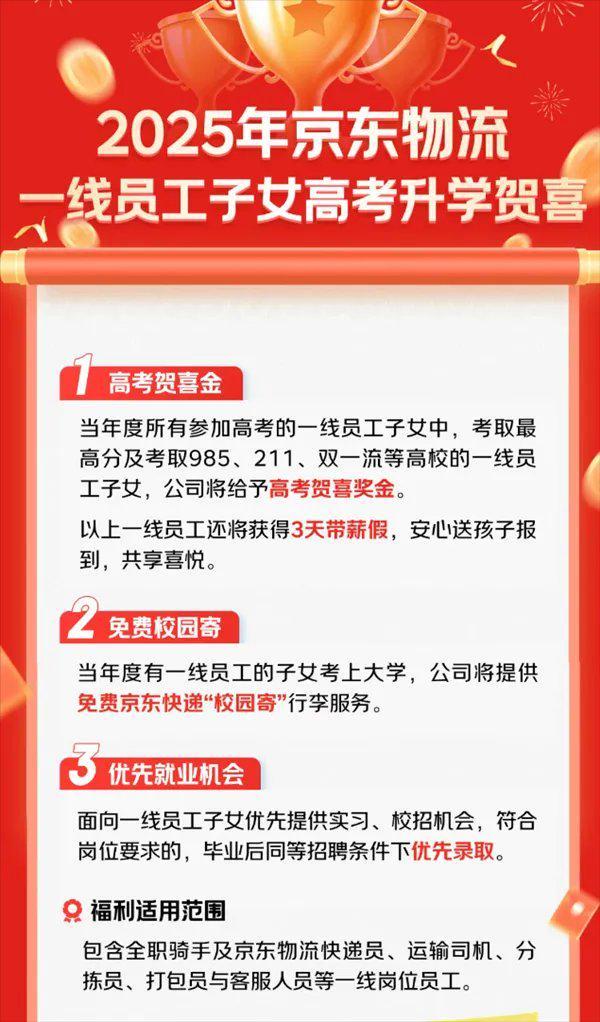 7月31日,京东宣布对今年参加高考并被大学录取的一线员工子女给予奖励,覆盖岗位包括全职骑手、快递员、运输司机、分拣员、打包员及客服人员等。奖励内容包括高考贺喜金、免费校园寄和优先就业机会。其中,考取最高分及985、211、双一流高校的一线员工子女将获得高考贺喜金和3天带薪假;考上大学的员工子女可享受免费京东快递“校园寄”行李服务;未来就业时,京东物流将为这些员工子女提供实习和校招机会,符合岗位要求的在同等条件下优先录用。