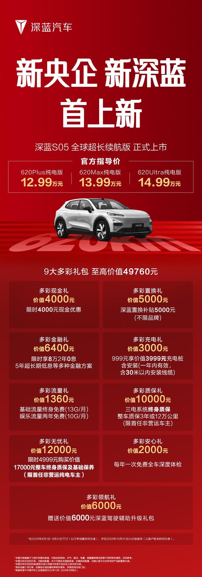 纯电续航620km 深蓝S05超长续航版售12.99万元起