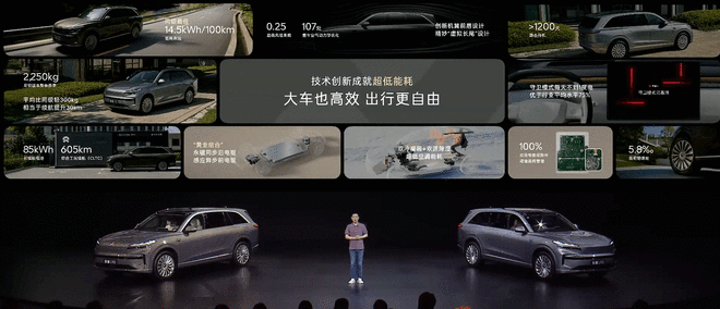 乐道L90的后电驱采用全球首款W-Pin绕组永磁同步电驱,比400V同功率电驱线损减少81.3%,比普通散热系统高30%高功率。通过整车重量、风阻系数、电驱效率、轮胎滚阻的多维度优化,乐道L90最终实现14.5kWh/100km同级最低能耗水平,守卫模式下可以做到每天不到1度电。新车全系标配85kWh电池包,CLTC工况下,后驱版本百公里能耗低至14.5kWh,续航里程605km;四驱版本能耗为15.4kWh/100km,续航里程为570km。