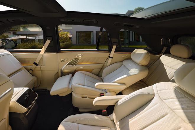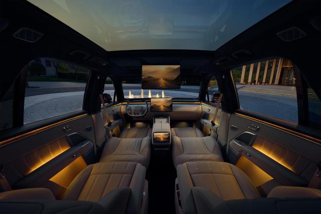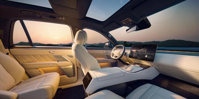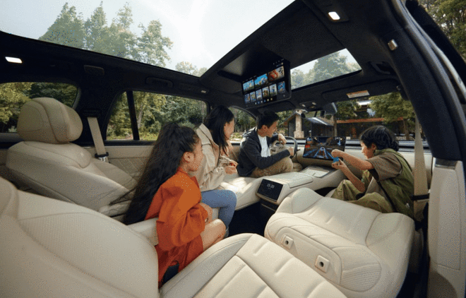 新车后排也配备了17.3英寸3K吸顶屏和8英寸控制屏,搭配8.86升可0-50摄氏度多档调节的车载冰箱,拥有六种专属存储模式,官方表示冰箱待机一周只需两度电,支持离车锁车不断电。前后排双天幕设计,面积高达1.1㎡,还有100%全遮光的双电动遮阳帘,可直接物理防晒。磁吸隐私遮阳套装,有侧窗遮阳帘和全车隐私帘。