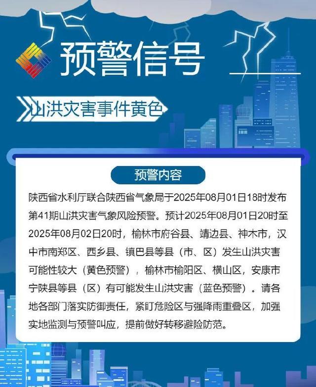 陕西省水利厅联合陕西省气象局于2025年08月01日18时发布第41期山洪灾害气象风险预警。预计2025年08月01日20时至2025年08月02日20时,榆林市府谷县、靖边县、神木市,汉中市南郑区、西乡县、镇巴县等县(市、区)发生山洪灾害可能性较大(黄色预警),榆林市榆阳区、横山区,安康市宁陕县等县(区)有可能发生山洪灾害(蓝色预警)。请各地各部门落实防御责任,紧盯危险区与强降雨重叠区,加强实地监测与预警叫应,提前做好转移避险防范。