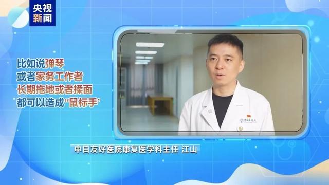 中日友好医院康复医学科主任 江山:弹琴或者是一些家务工作者,长期拖地或者揉面,都可以造成“鼠标手”。